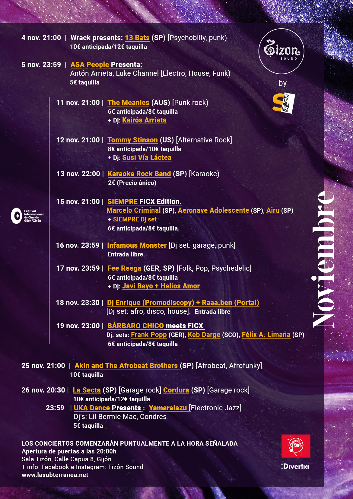 Así que por favor… no queremos que ninguno de estos artistazos tengan que comenzar un bolo con una sala vacía aún, ni que nadie se pierda una sola nota de lo que tienen que contarnos. Adelantemos todos un poco la hora de la merienda y recibámosles a la hora señalada.